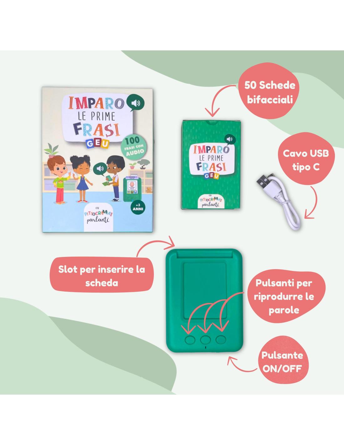 Include 50 flash card Montessori fronte-retro: 100 frasi semplici e quotidiane, ciascuna accompagnata da pittogrammi chiari che facilitano l’associazione visiva e uditiva. Perfette per stimolare la comprensione e la produzione del linguaggio.