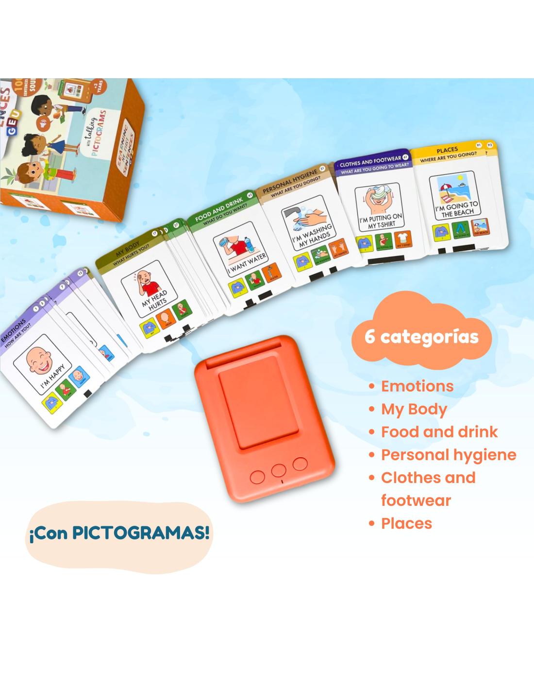 Include 50 flash card Montessori fronte-retro: 100 frasi semplici e quotidiane, ciascuna accompagnata da pittogrammi chiari che facilitano l’associazione visiva e uditiva. Perfette per stimolare la comprensione e la produzione del linguaggio.