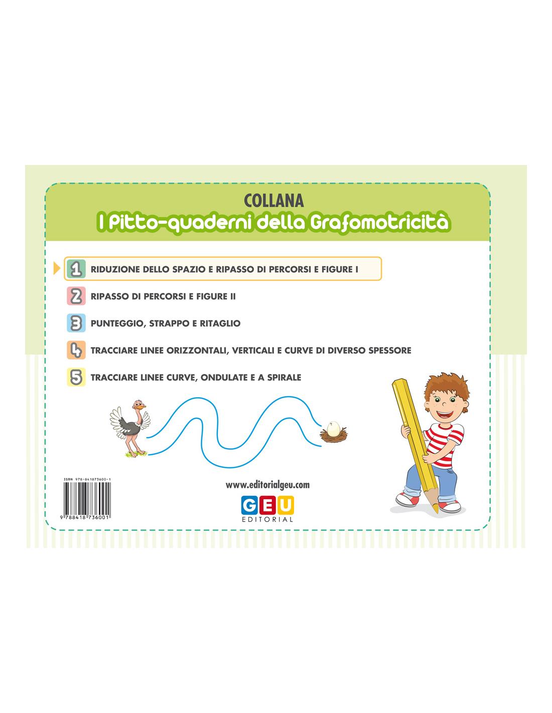 Il primo dei cinque quaderni della collana di grafomotricità include un totale di 57 schede (una scheda per pagina) con attività di difficoltà progressiva al fine di motivare l’alunno nel processo di apprendimento. Le schede si dividono in tre tipi di attività differenziate: tracciato libero, tracciato di figure geometriche e percorsi.
