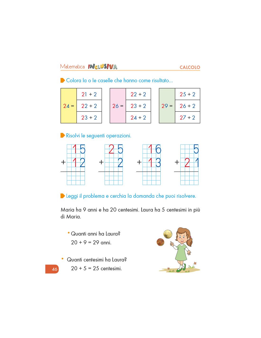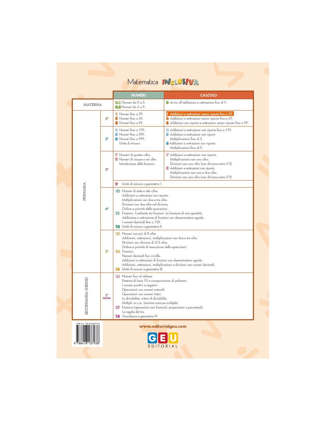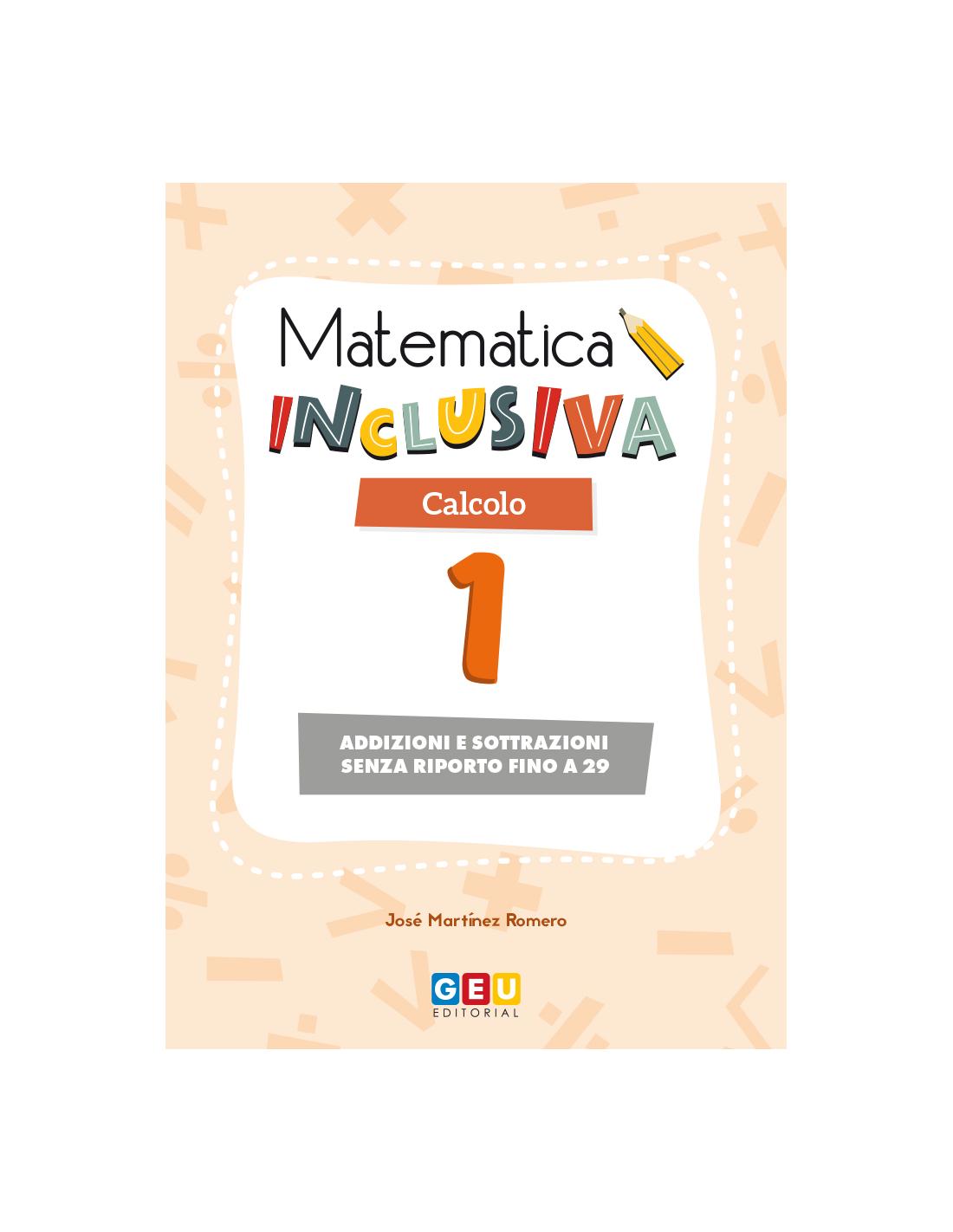 Il quaderno 1 di Matematica Inclusiva lavora sulle addizioni e sottrazioni senza riporto fino a 29, e sulla risoluzione di problemi con un’operazione. In generale, è adatto ai bambini della 1a elementare.