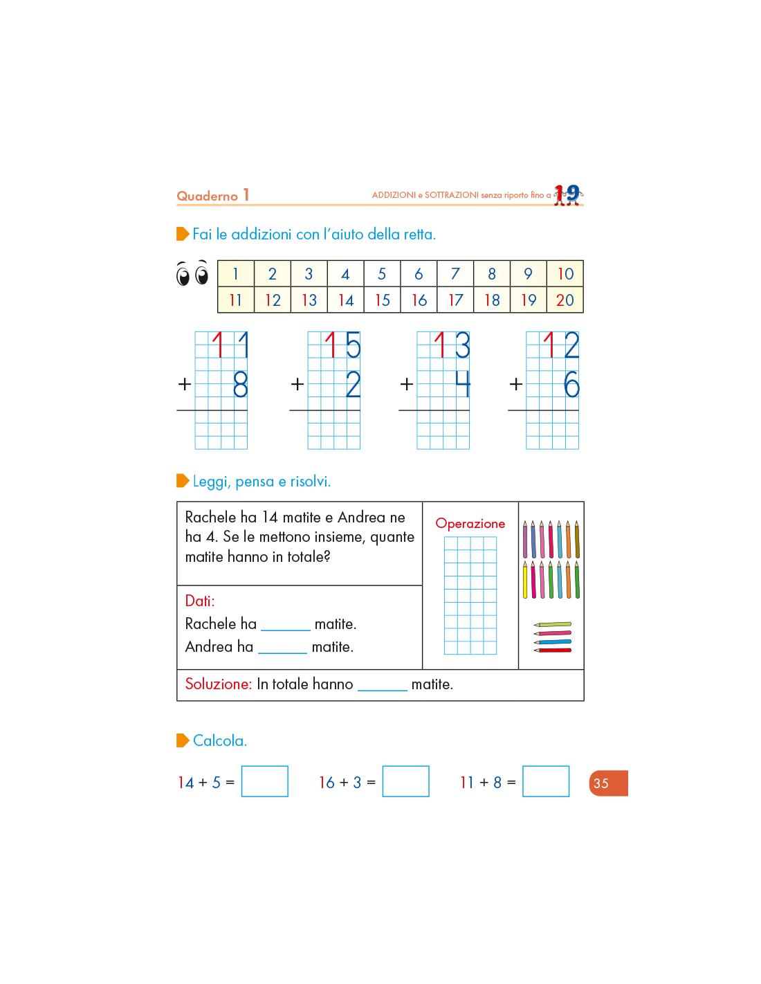 Come materiale di sostegno, il quaderno 1 di Calcolo include diversi strumenti per migliorare il calcolo mentale e le abilità per sommare, sottrarre, contare in modo divertente e rappresentativo: