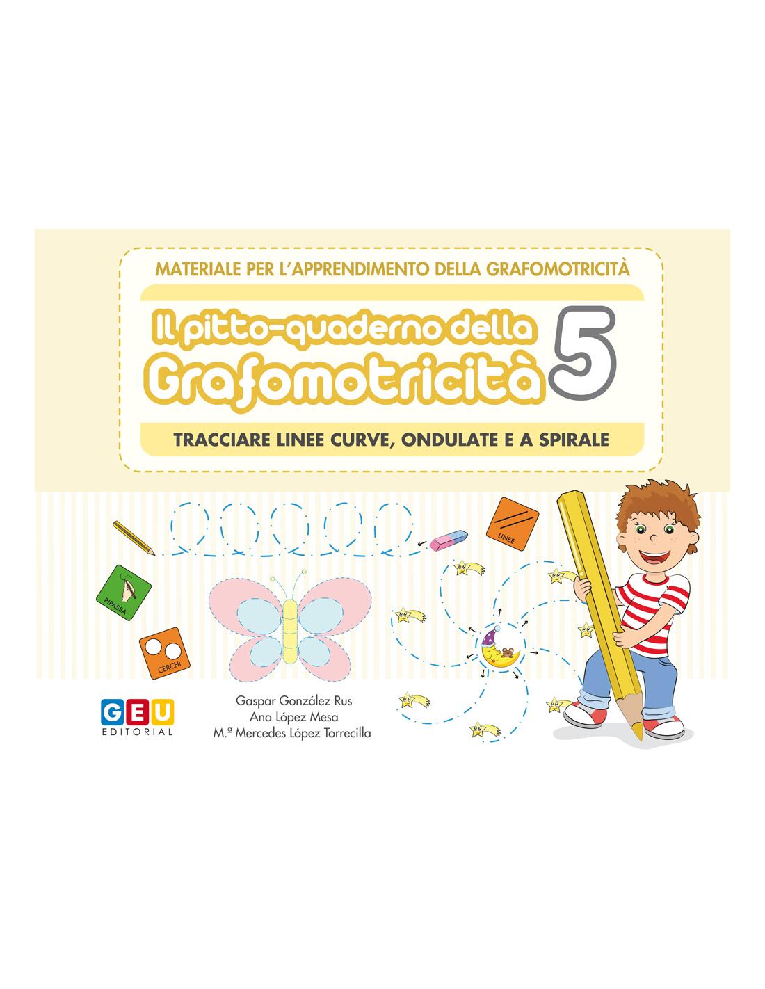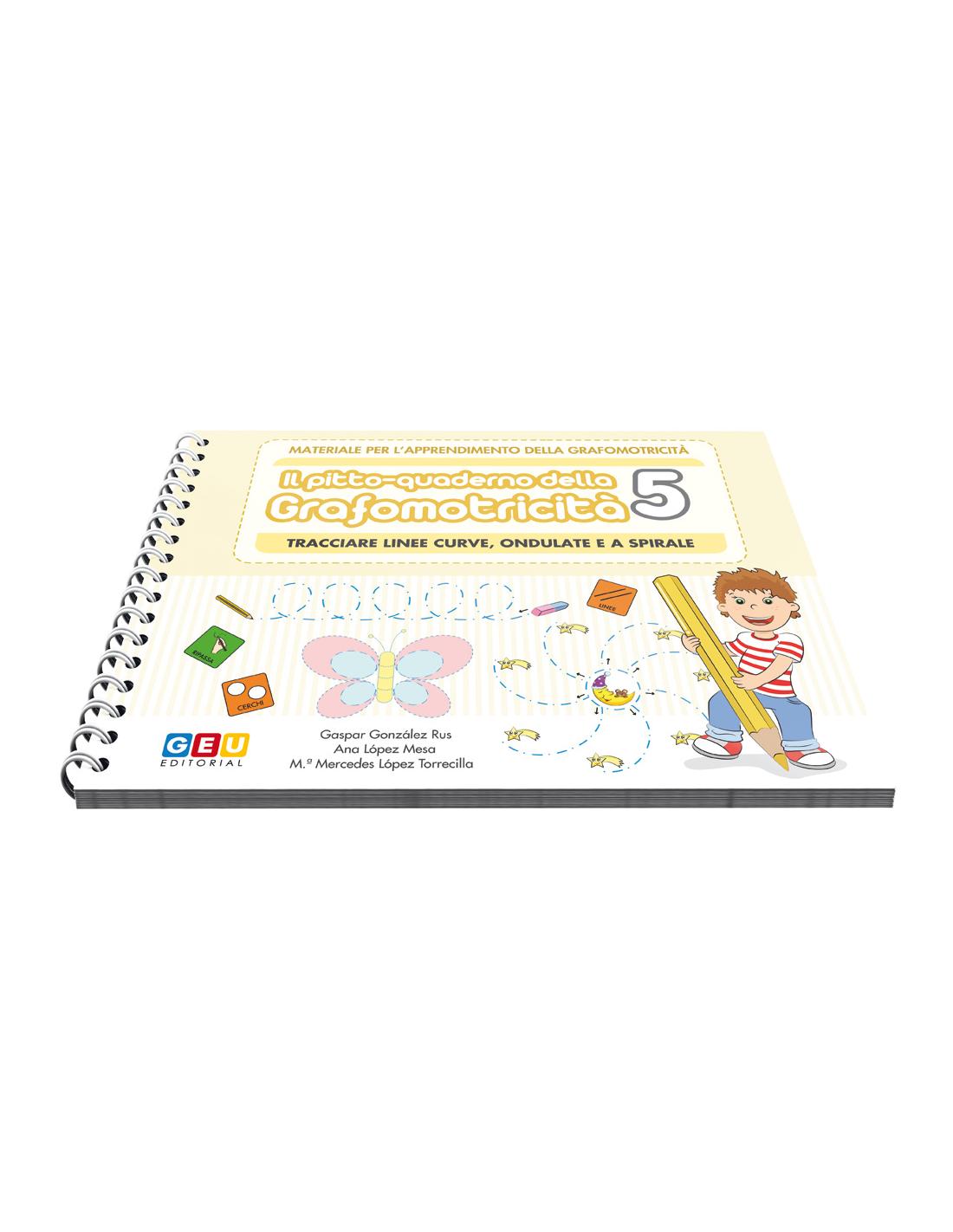 Con il Pitto-quaderno della grafomotricità 5 – Tracciare linee curve, ondulate e a spirale si vuole migliorare l’impugnatura e il controllo oculo-manuale nel momento in cui si preme sul foglio di carta con la penna. Attraverso i sostegni visivi (pittogrammi) il bambino può migliorare la propria calligrafia.