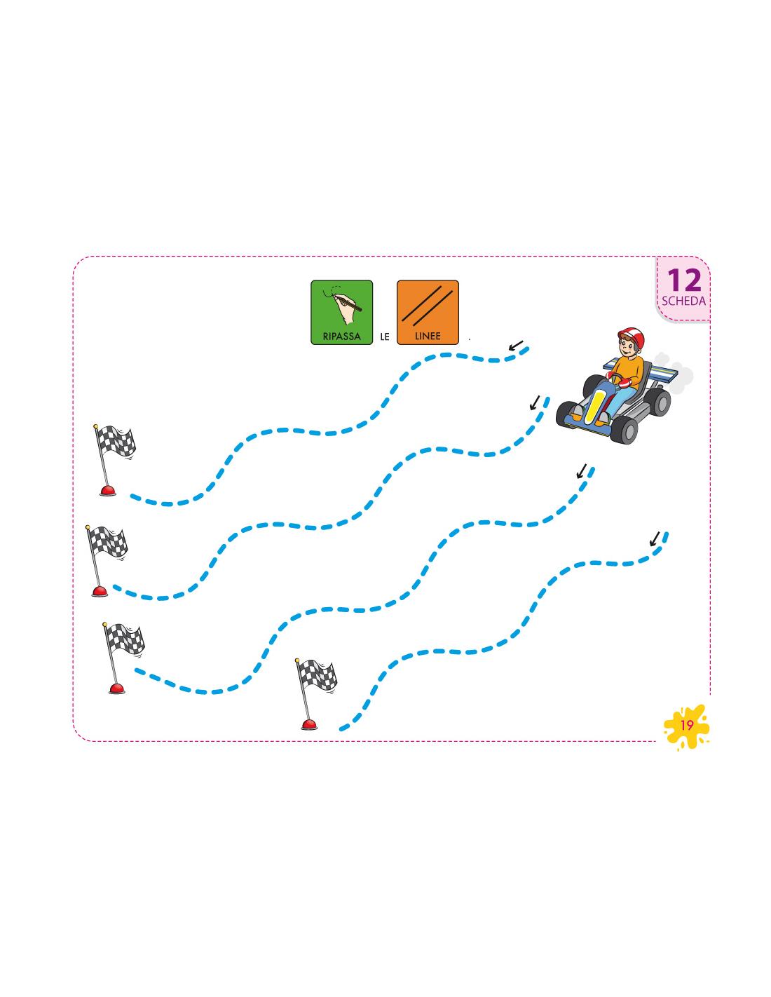 Inoltre, c’è un foglio di registro e controllo delle attività dove, per ogni gruppo di schede, si potrà valutare il lavoro del bambino: si adatta allo spazio, non esce dai confini, impugna correttamente, preme bene con il pennello/matita, non lascia spazi, realizza i gesti grafici adeguati, utilizza diversi colori, colora le zone in modo omogeneo, inclina correttamente il materiale, non alza il pennello/la matita dal foglio. Tutto ciò con la possibilità di calcolare un risultato finale.